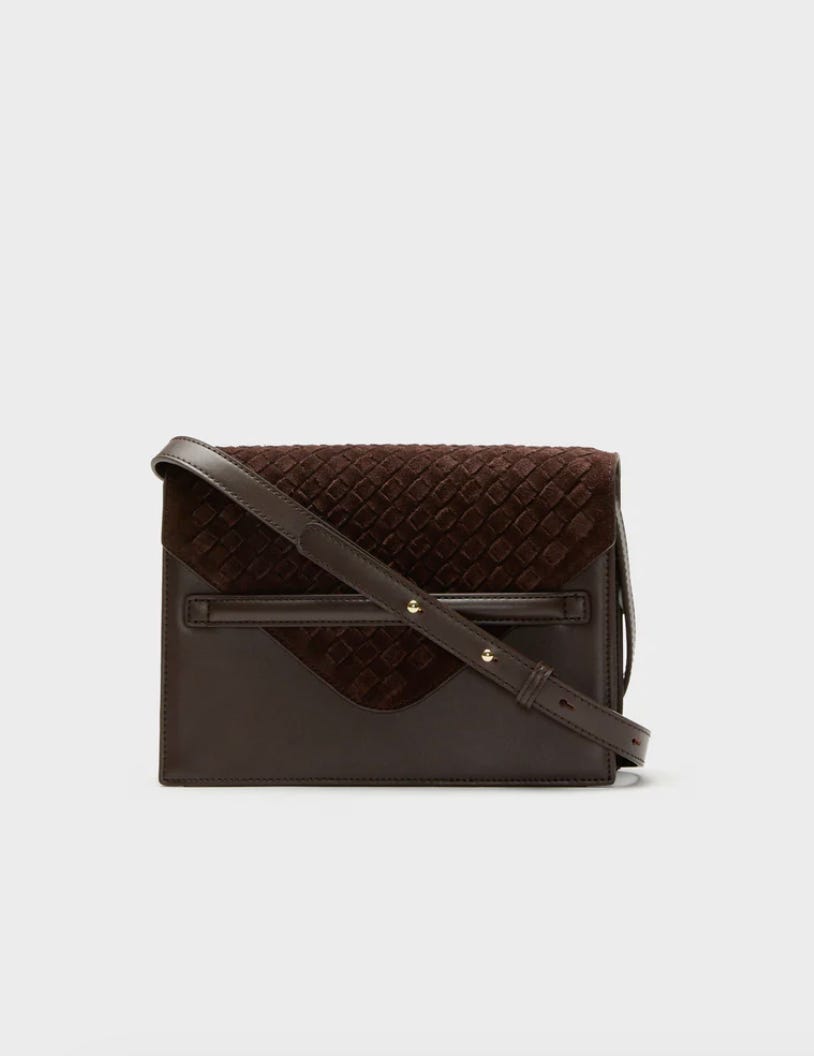 Next up is this chocolate leather crossbody bag, with the woven suede detail on the front flap.