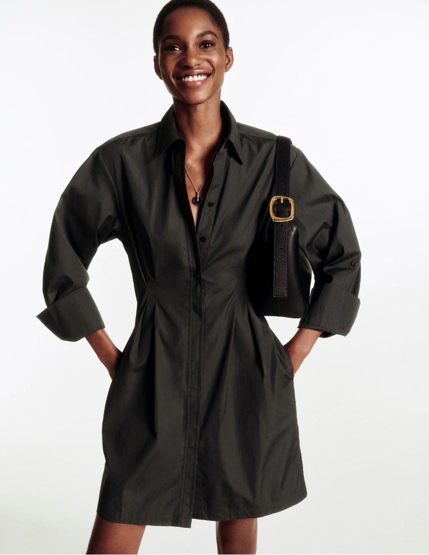 This cinched-waist shirt dress is a versatile classic piece in a rich, deep green.